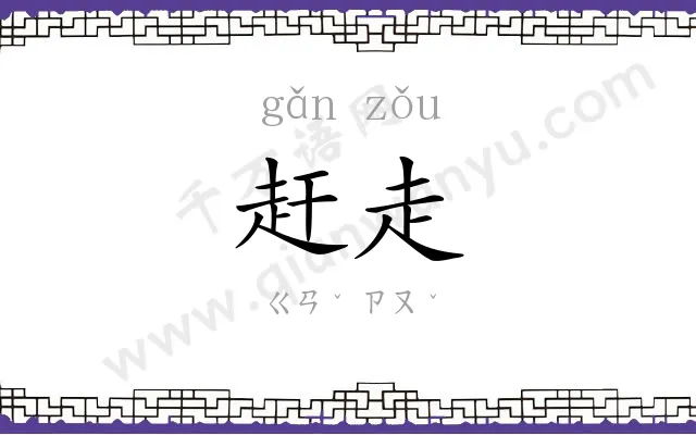 赶走,指赶路,从速行走;强迫离开。