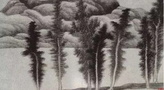头鲜润而有透明感,明暗对比强烈,极富光感。龚贤画树,也和山石配合得很好,画山石用干笔反复皴染,画树干则很少皴擦或完全不皴擦,更不渲染,仅以湿笔、中锋直勾。往往一片浓黑的石头中突出几株白色的树干,或在一片浓黑的树叶中包围白色的树干。淡色的山石中又画浓黑的树叶,从而形成黑白鲜明的对比,墨色的加深,发展了“亮”墨,建立了富有明亮光感的画面,这一点是他对中国画做出的独特贡献。