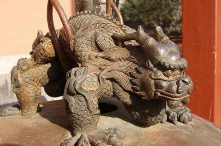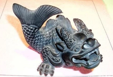 它头和自己的老爹像,不过后身是鱼形,嘴巴长得大,能够喷出大浪来,所以,古人经常把它的雕像立在屋脊上,寓意消除火灾,平平安安。