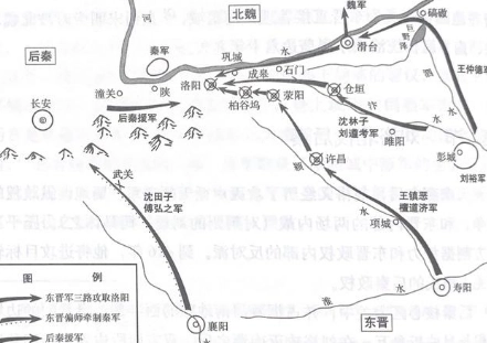 九月,刘裕率军进至彭城(今江苏徐州)。督前锋诸军事的王仲德军先顺利打通了钜野泽被淤塞的旧河道,并在东郡凉城大破北魏军,收复凉城,进而攻克北魏占领的滑台,收复黄河东线。前锋王镇恶、檀道济军也进展顺利,自进入秦境以来所向皆捷。秦将王苟生以漆丘(今河南商丘以北)降于王镇恶军;徐州刺史姚掌以项城(今河南沈丘)降于檀道济军;后秦新蔡(今河南新蔡)太守董遵坚守城邑不降,檀道济攻克该城,将董遵斩杀,旋即攻克了重镇许昌(今河南许昌东),俘获颍川太守姚垣及大将杨业。与此同时,建武将军沈林子军,自汴水进入黄河,襄邑(今河南睢县)董神虎率领1000多人响应晋军。沈林子随即与他共攻仓垣(今河南开封北),攻克了该城,后秦兖州刺史韦华降服。