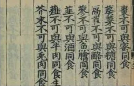 猪羊疫死者,不可食。曝肉不干者,不可食。马肝、牛肝,皆不可食。兔合眼,不可食。烧肉,不可用桑柴火。獐、鹿、麋,四月至七月勿食。二月内,勿食兔肉。诸肉脯,忌米中贮之,有毒。鱼馁者,不可食。羊肝有孔者,不可食。诸鸟自闭口者,勿食。蟹八月后可食,余月勿食。虾不可多食,无须及腹下丹,煮之白者,皆不可食。腊月脯腊之属,或经雨漏所渍、虫鼠啮残者,勿食。海味糟藏之属,或经湿热变损,日月过久者,勿食。六月、七月,勿食雁。鲤鱼头,不可食,毒在脑中。诸肝青者,不可食。五月勿食鹿,伤神。九月勿食犬肉,伤神。十月勿食熊肉,伤神。不时者,不可食。诸果核未成者,不可食。诸果落地者,不可食。诸果虫伤者,不可食。桃杏双仁者,不可食。莲子不去心,食之成霍乱。甜瓜双蒂者,不可食。诸瓜沉水者,不可食。蘑菇勿多食,发病。榆仁不可多食,令人瞑。菜着霜者,不可食。樱桃勿多食,令人发风。葱不可多食,令人虚。芫荽勿多食,令人多忘。竹笋勿多食,发病。木耳色赤者,不可食。三月勿食蒜,昏人目。二月勿食蓼,发病。九月勿食着霜瓜。四月勿食胡荽,生狐臭。十月勿食椒,伤人心。五月勿食韭,昏人五脏。