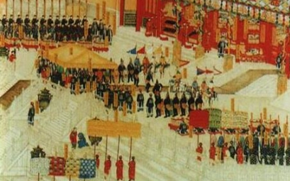 诏书一般先由皇帝颁发,颁诏仪式开始,内阁学士穿朝服,恭恭敬敬地捧着诏书,安放于太和殿东侧的黄案上。皇帝盖上御玺后,经过一套烦琐的礼仪,然后由礼部尚书在太和殿用云盘承你诏书。这时文武百官均已按官阶高低在外金水桥南排队肃立。