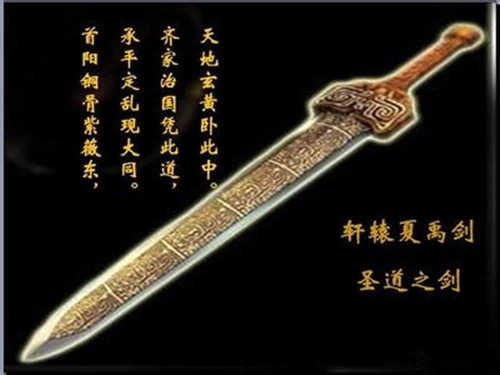 圣道之剑。黄金色的千年古剑,传说是天界诸神赐于轩辕黄帝击败蚩尤的旷世神剑;由众神采首山之铜为黄帝所铸,后传与夏禹。剑身一面刻日月星辰,一面刻山川草木。剑柄一面书农耕畜养之术,一面书四海一统之策。为传说中的神剑。