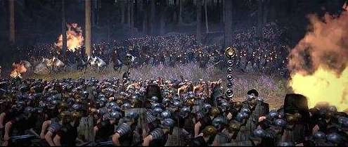 罗马军的布阵如下:最前面是三个重骑兵大队,每队大约300人;然后是6个轻步兵大队,每队大约 500人;然后是数十名军号手和数百名弓箭手;再往后,就是三个列成方阵的重步兵军团,每个军团6000人;这 三个军团的中央,骑在高头大马上的,便是威风凛凛的瓦卢斯总督本人,他的司令部参谋人员及卫队簇拥在他 周围,共约2000人;在兵团两翼掩护的是一些日耳曼、色雷斯和非洲的轻骑兵,共约3000人;殿后的则是随军 家属、后勤人员、医生、厨师、奴隶等。全军总人数超过三万,战斗人员数目约有25000人,相当于那时罗马帝 国总兵力的十分之一。沿着条顿堡丘陵北麓林间大道前进没多久,他们就不得不改变自己的阵形了,因为左方 出现了一个巨大的石灰岩山包,而右方则出现了一片广阔的沼泽,它们之间相距只有几百米。两旁的灌木丛越 来越密,丘陵越来越多,道路越来越窄,也越来越泥泞,因为天开始下雷雨了,而且雷越来越响,雨也越来越 大。响亮的雷声、雨声、风声汇聚在一起,怎么听怎么像是两军人马在激烈地厮杀。一般说来,雷雨总不会持 续时间太久,但这次却不然。几个钟头过去了,敌人没有能够找到,阿米尼乌斯的部队也不知道去哪里了,而 罗马将士们却全都被淋成了落汤鸡。受气候影响,他们垂头丧气、胆战心惊地走着,但决不会想到,全日耳曼 尼亚行省的反罗马武装力量,此时此刻正像猎人一样,埋伏在他们身旁的那些灌木丛和丘陵后面,等着他们这 些猎物走进陷阱的最深处。