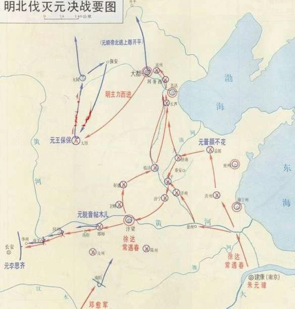于是乎,朱元璋将目光放到了北方。公元1367年11月,朱元璋命徐达为征虏大将军,常遇春为副将军,率领25万大军进行北伐。在北伐檄文中提出“驱逐胡虏,恢复中华,立纲陈纪,救济斯民”的口号。元顺帝此时信任喇嘛僧,沉迷于天魔舞与声色欢娱之中。
