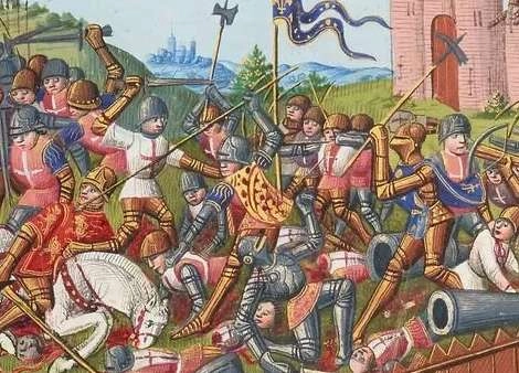 结果,数目有限且兵种单一的英军,在自己的阵地上遭遇了两股法军的联合攻击。几小时内,法国前军的火炮都在长弓射程外轰击英军阵地。怒不可遏的英国人,只能鲁莽的冲出防线,杀向法军的炮兵阵地。依靠下马骑士和扈从的猛攻,他们暂时击溃了当面的法军炮兵和步兵。但另一支法军重骑兵部队,已经从侧翼赶到。