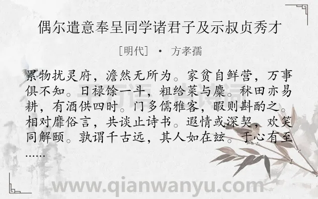 《偶尔遣意奉呈同学诸君子及示叔贞秀才》作者是明代的方孝孺.诗词全文约共144字.